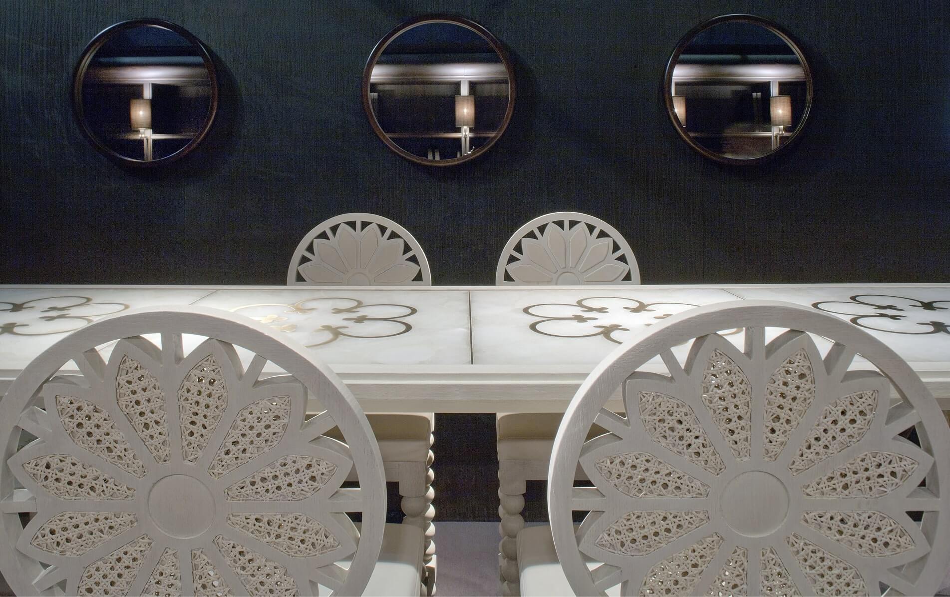 The walls envelop the environment in a dark grey with a bluish tint, enlivened by the addition of greyish blue curtains that drape the walls, conferring to the room a sense of warmth and a diffuse charm. The parquet, in dark wood with grey graining, is warmed by the soft colours of fine carpets that make it even more welcoming and comfortable. The display is divided into two spaces by a backlit openwork panel that outlines floral and geometric motifs which confer a solemn, luminous visual effect to the room. The light grey beams which punctuate the perimeter are structural and decorative, reinforcing the sensation of being in a northern European dwelling, a whimsical manor in Oxfordshire or a sumptuous chalet in Normandy. The extreme care and the exquisite colours, finishes and materials recreate a refined, out of the ordinary living style which proposes different compositions collected into a journey inside an eccentric living room: the perfect frame for the Blend Collection pieces. Not only was the set - up created by the architects but also the products illustrated here were designed by Archer Humphryes for the collection - named 4 Quatrefoils.