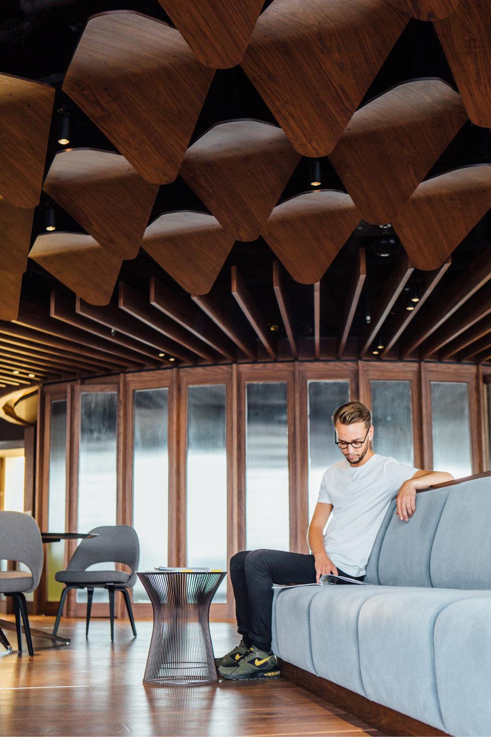 A number of bespoke furniture items have been designed to sit within the lobby, including the banquette seating and the free standing bar. These respond to the geometry of the scheme and room and also provide continuing unbroken curved forms. The loose furniture has been selected from period pieces aligned with the schemes inspiration including items designed by Carlo Molino, Eero Saarenin and Fred Scott.