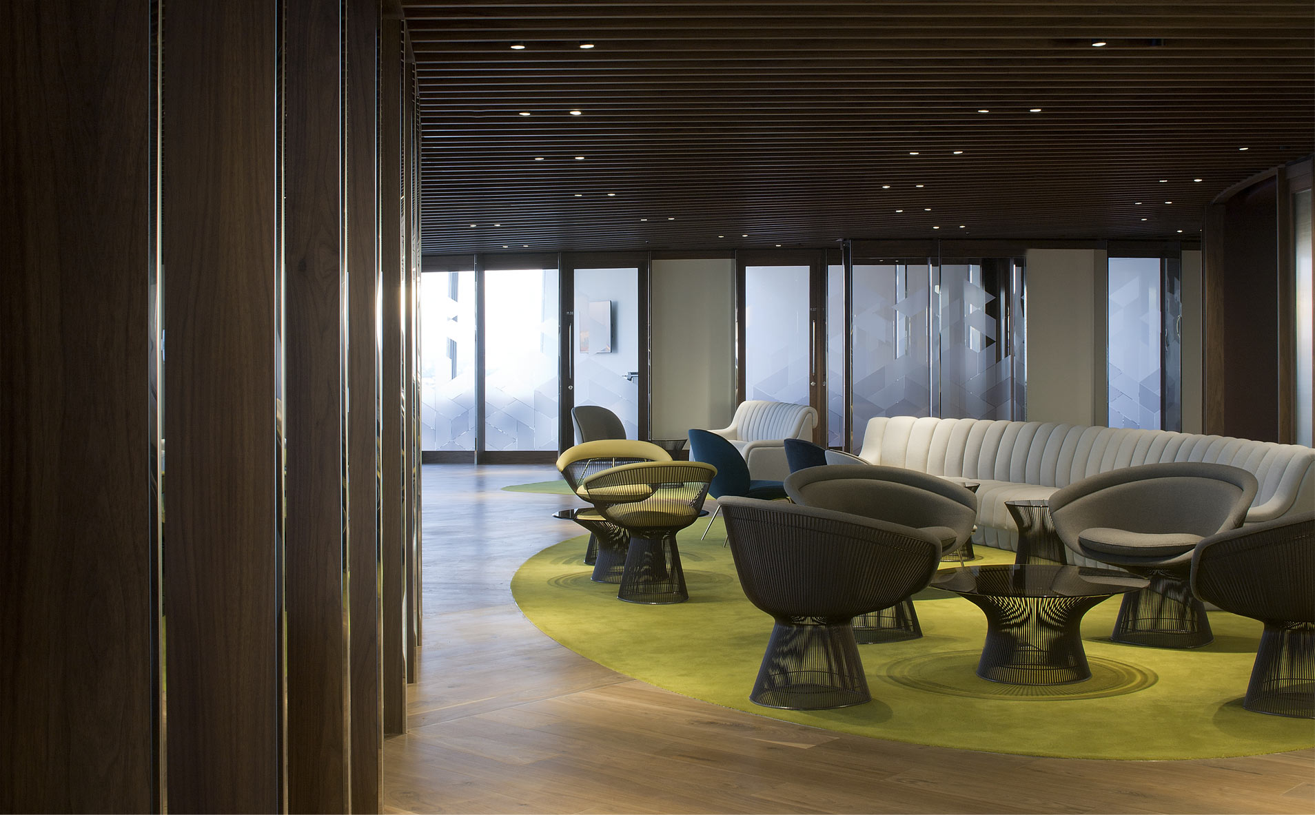 The design organises the working areas around a loose form of concentric and compound curves . The character of the wall finish differs with the internal core being clad in American Black Walnut ribs giving it warmth and rhythm and the outer curve defined with fins of polished stainless steel endlessly reflecting the light and office users as they circulate through the spaces. The plan forms are inspired by shapes drawn from Ellmsworth Kelly and provide a sense of continual movement while circulating around the building. The internal core is lined in ribbed glass and mirror which reflects the strong light penetrating the building to the centre of the plan. The office partition is of a different nature , the curves peel away to open views and vistas focused on the intersection of the façade’s glazed panels. Here the office space gives way to informal break out areas that sit against the façade and provide long views , tea and coffee points recessed into the internal core and carefully selected furniture items for relaxing and meeting. The upper floor provides 17 working suites and the lower floor 13 .