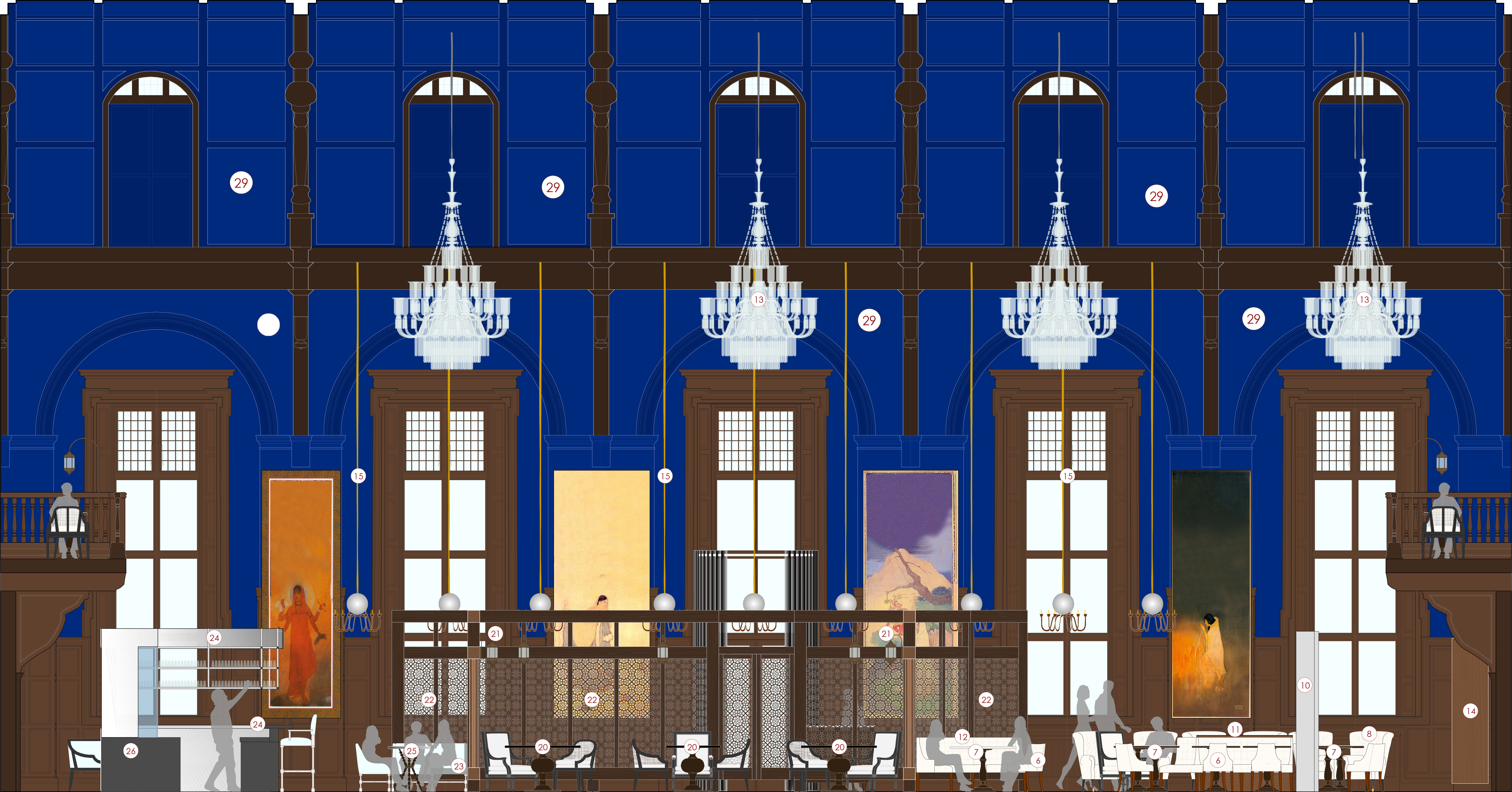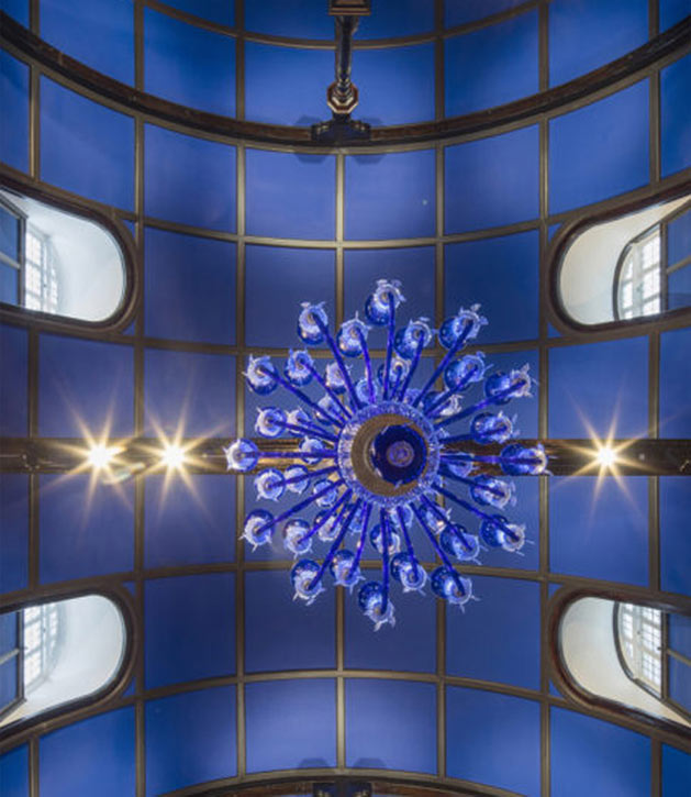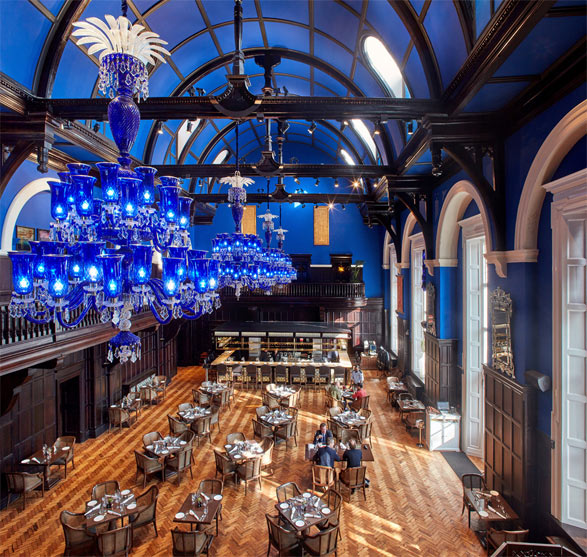 Keeping original ‘Edwardian Baroque’ details in the seventy-room hotel and adding decoration and embellishment with traditional Indian furniture and antiques, a harmonious Indian—Anglo aesthetic is described further: “The most glorious room is the Baluchi restaurant, which is in the former assembly hall: the walls are doused in royal blue paint; Hyderabad-style chandeliers made from sapphire-tinted glass hang from the vaulted roof. There’s a warmness to the sense of history here: original stone fireplaces are stuffed with blazing displays of red anthuriums; mullioned windows and wood-clad walls make for an atmosphere that’s intimate rather than imperious.”
