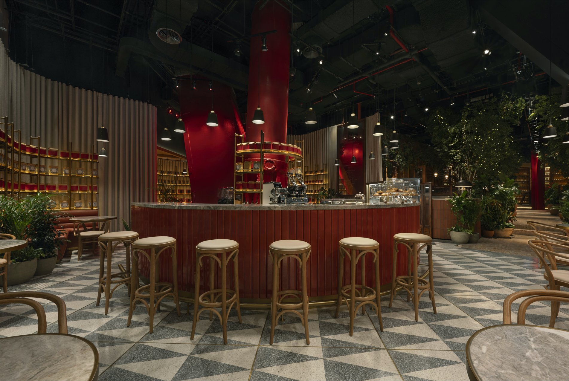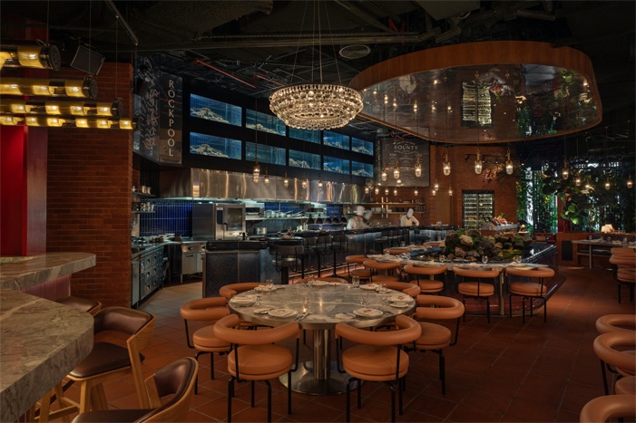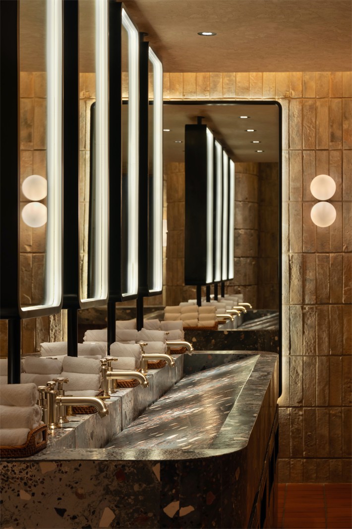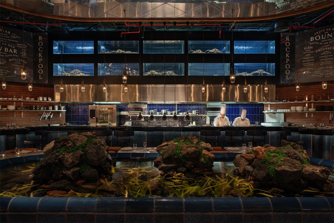 Each section has its own menu, ambiance, and service, with interior architecture defining each experience and providing a unifying identity and theatre. Social spaces sit amid avenues of trees, terracotta pathways, timber structures, a rockpool, and open fires – while tucked in cosy corners are secret garden-like intimate spaces.