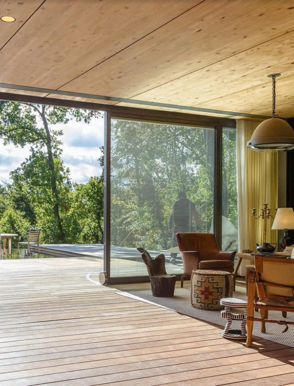 One house featured solid Slovenian Alpine Doughlas Fir walls in the interiors which create a texture and an aroma. A poured white resin floor allowed the light to be absorbed and for indoor and outdoor robustness. Bathrooms used moulded corian to form the sinks and storage cabinetry with acid etched with alternate mirror glass forming cabinets above. In the living areas and bedrooms the combination of white with solid trestle pages, painted ‘clay’ coloured textures, with occasional bursts of yellow and turquoise in the accessories were directly taken from the environment.