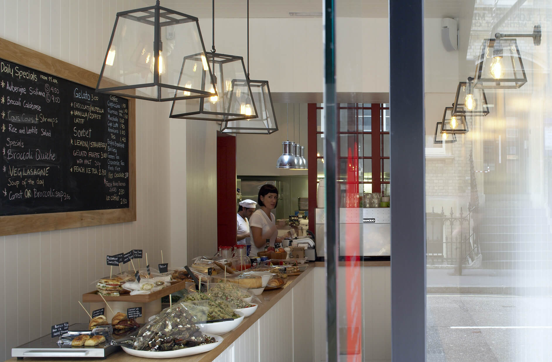 The focaccia bar is more sober employing natural oak, steel framed lanterns including a large colourfully painted glazed partition framing the preparation area. The design is expressive both of the continental character of the products on sale, as well as combining a playfulness for customers to enjoy when selecting and consuming the attractive products displayed.