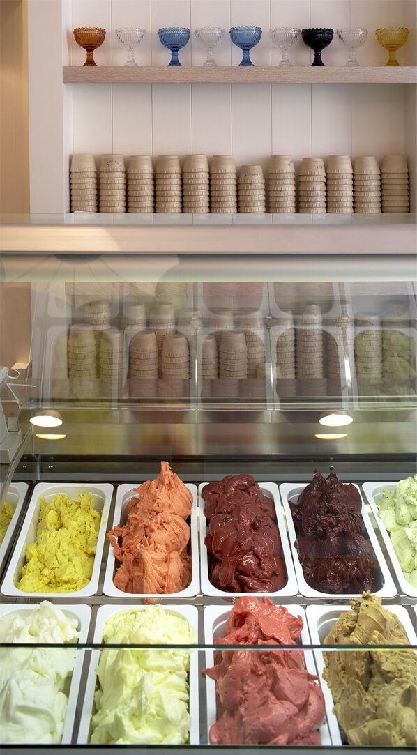 The design of Cocorino has been developed to provide two spaces of different character, one for the gelato bar and one for the focaccia counter.