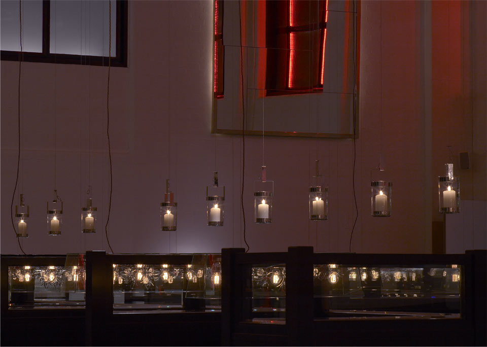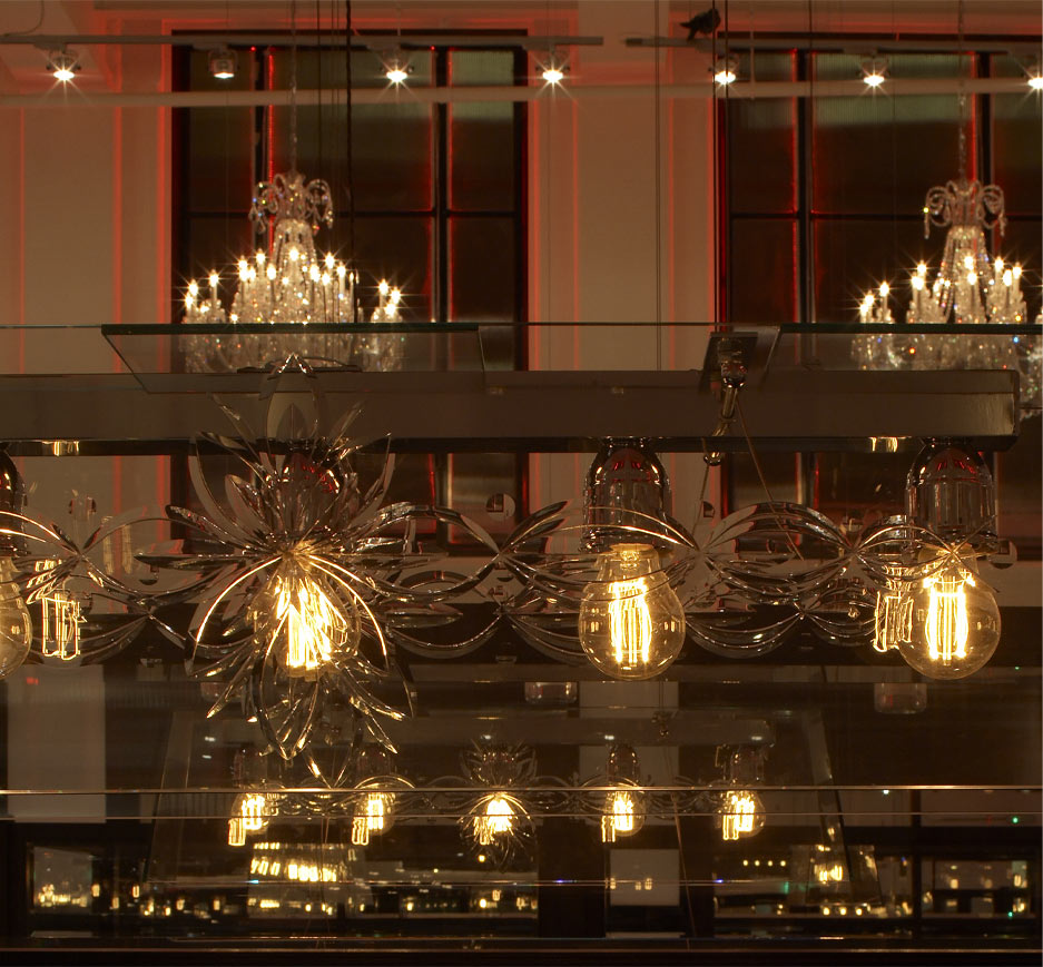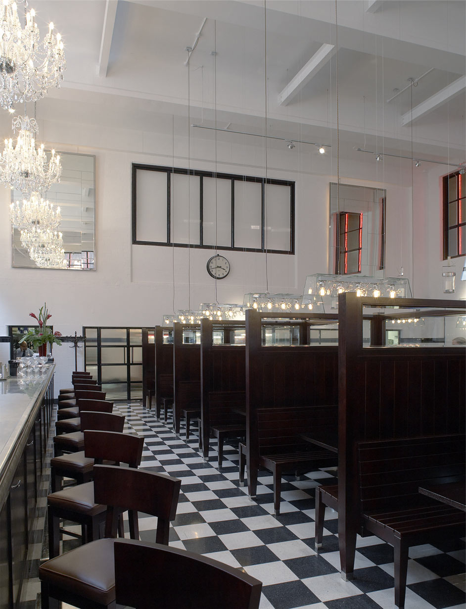 The restaurant occupies a dramatic 7m tall 1020 sqm space, entered via retrofitted reeded glass double doors. It features a dramatic mirror backed bar hung with Swarovski crystal chandeliers and an area of high backed banquettes, which create intimate enclosures in the voluminous floor. Custom built of oak wood and overhung with handmade contemporary cut glass light shades the arrangement pays homage to the formal dining booths of Chartier in Paris. This area is combined with less formal café seating and flanked by a patisserie and deli counter and the entire room is unified by a new black and white chequered terrazzo flooring.